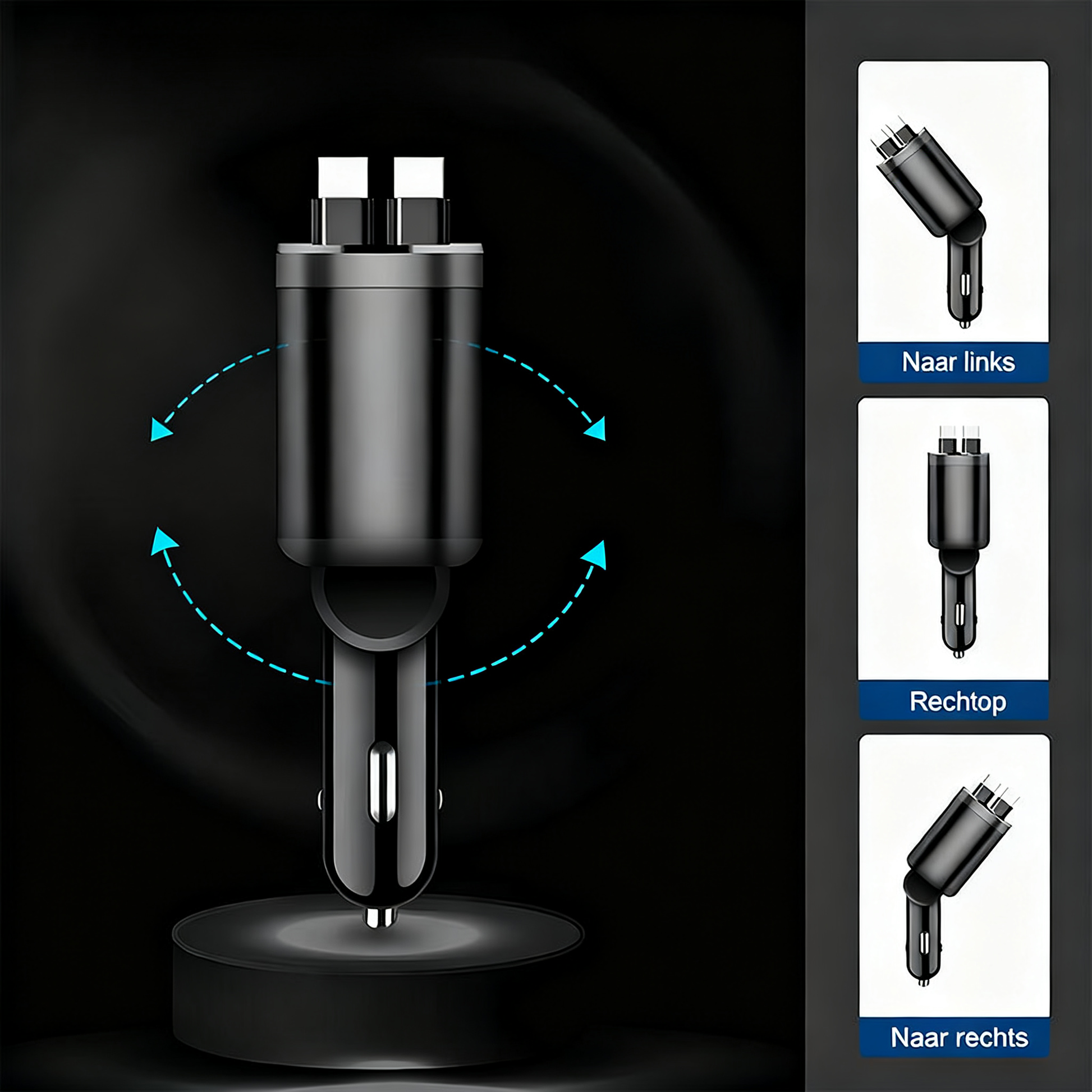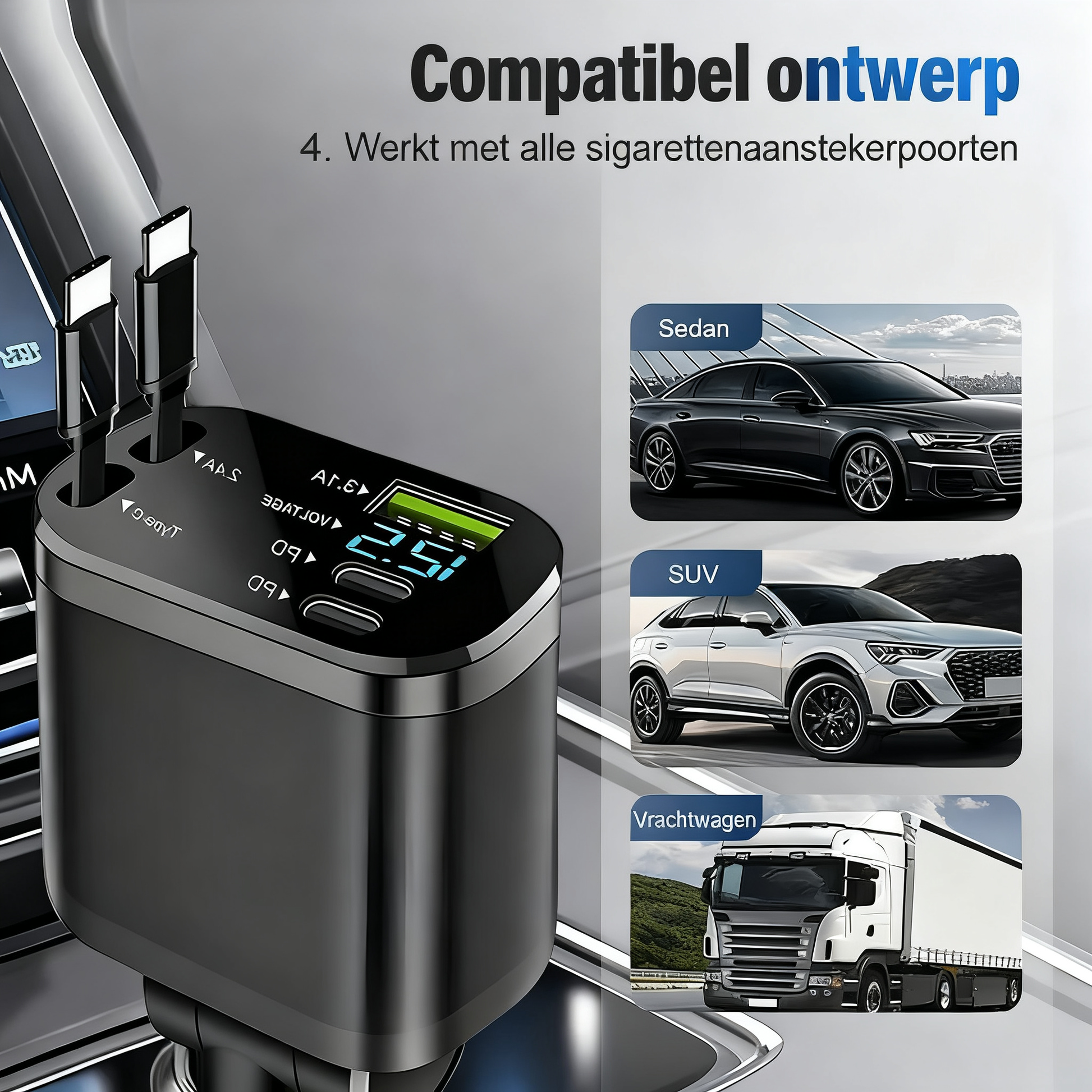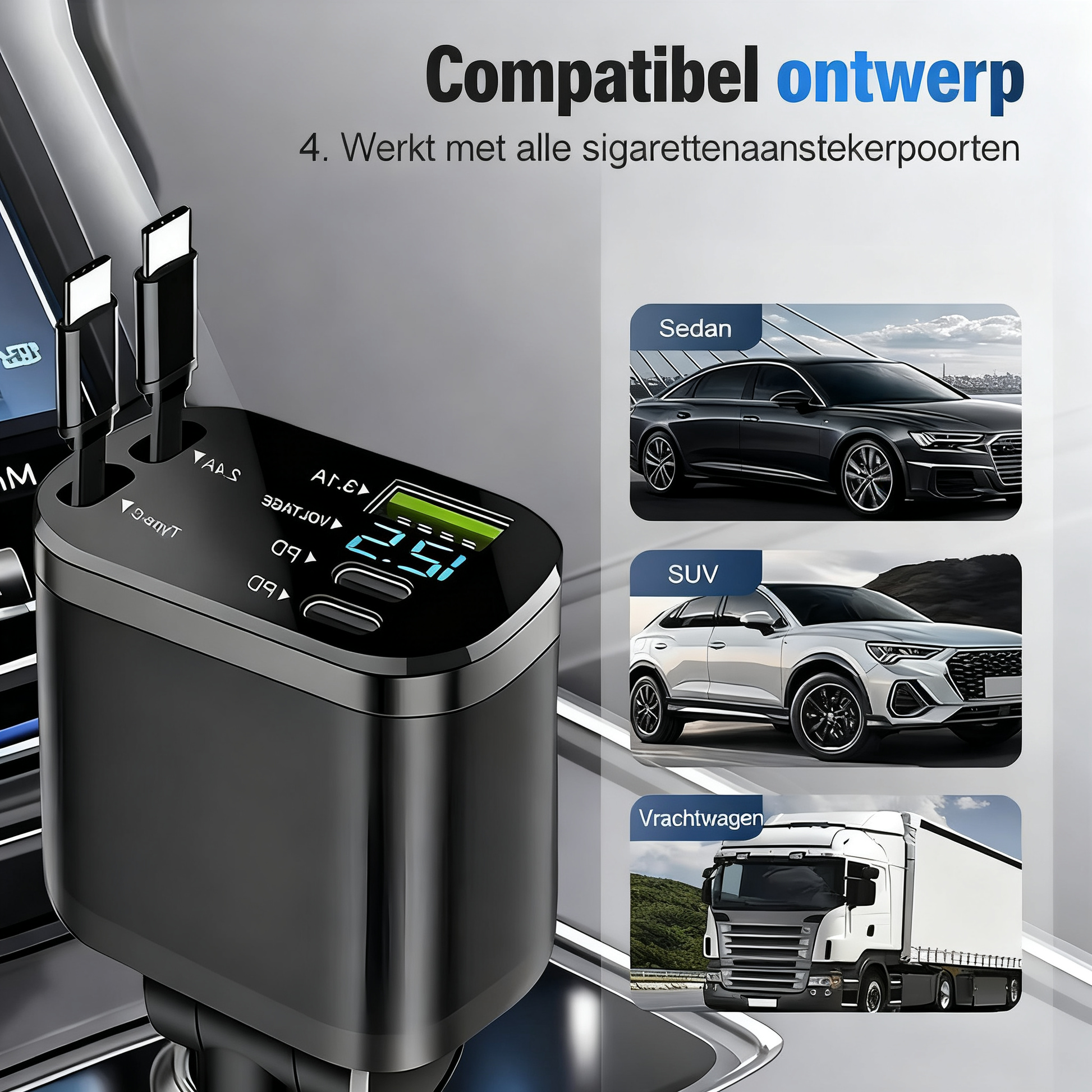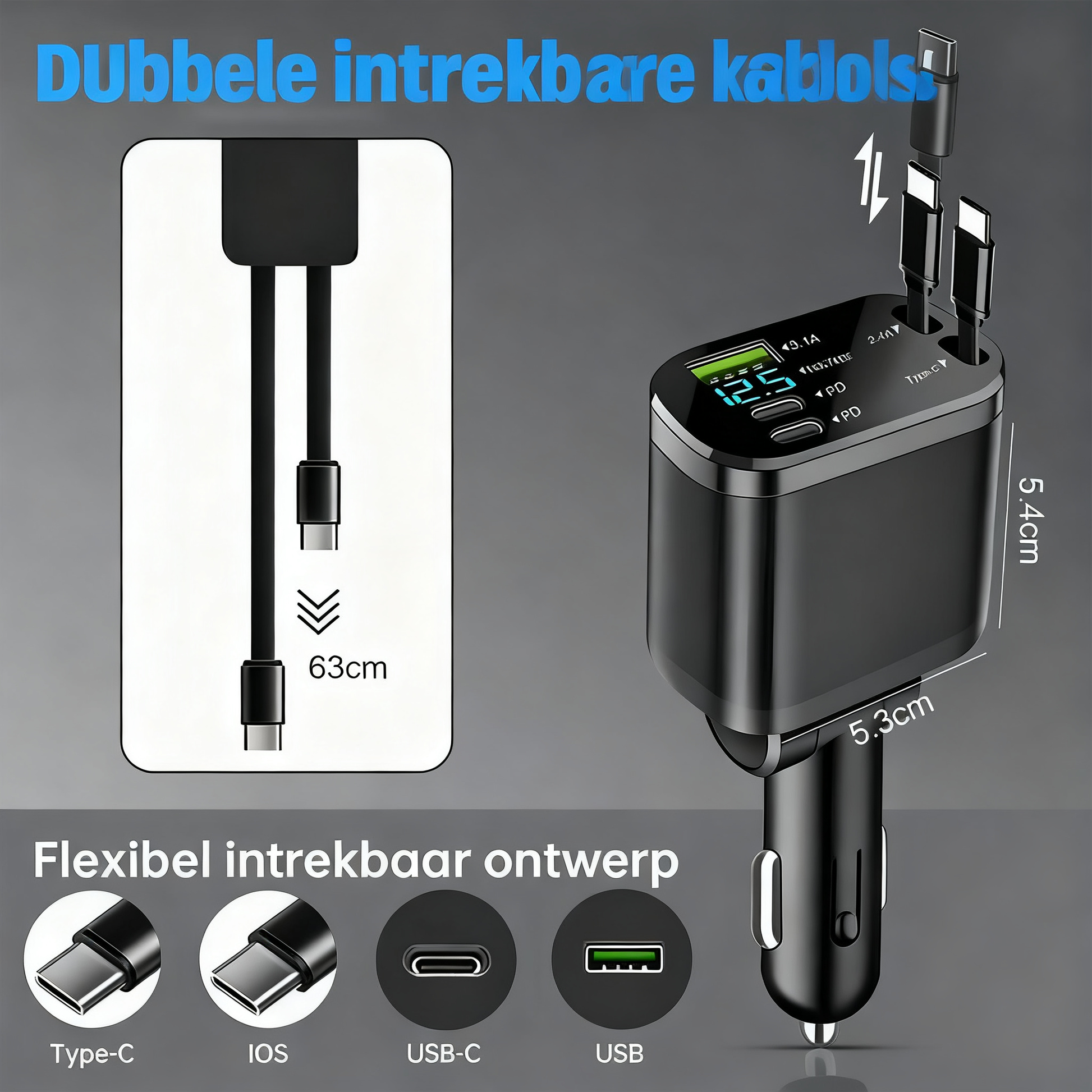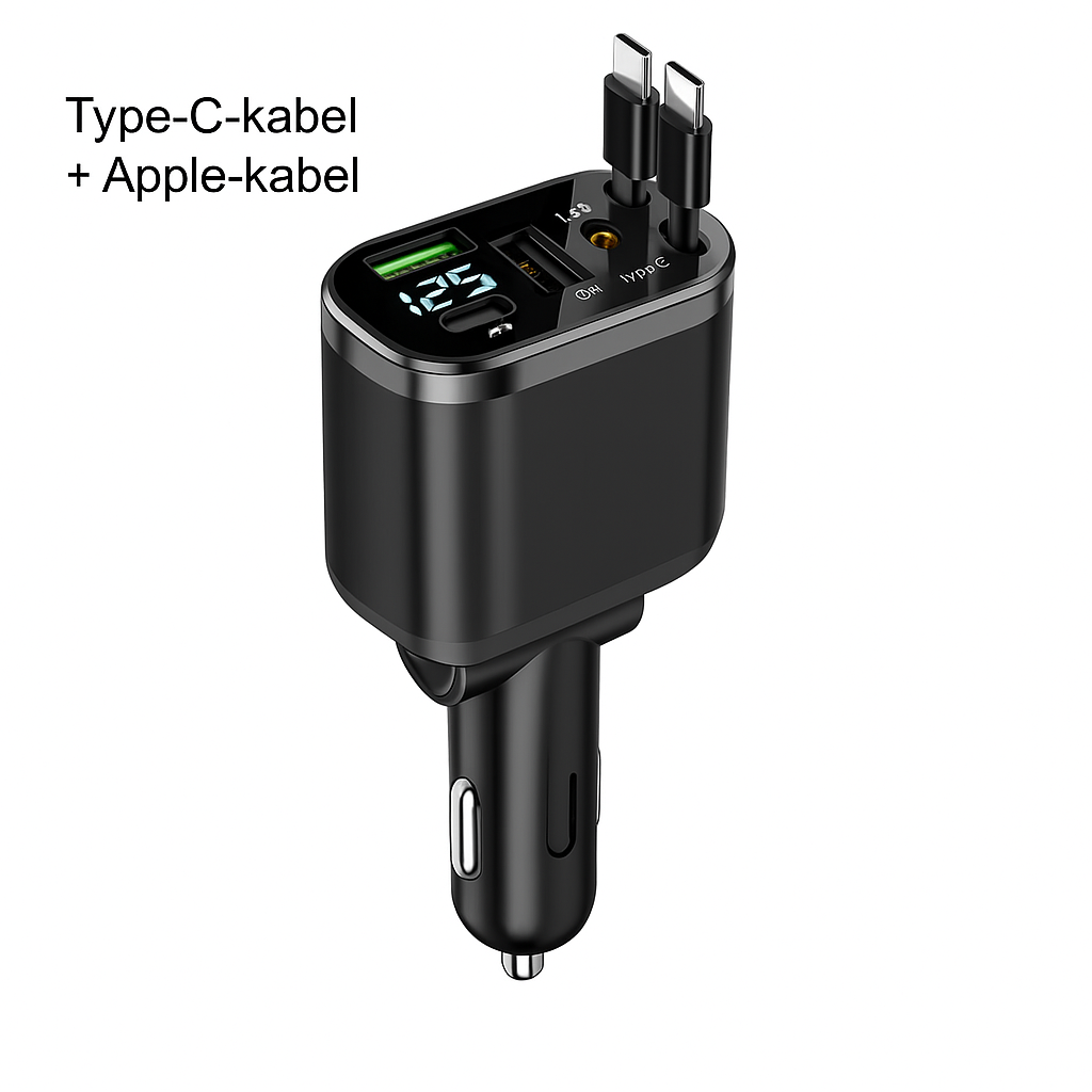 Geen kabelwirwar meer in je auto! Deze lader is uitgerust met 2 intrekbare oplaadkabels (Type‑C of Type‑C + Apple Lightning) die je met één simpele beweging uittrekt en weer opbergt. Zo blijft je auto netjes en heb je altijd de juiste kabel binnen handbereik – ideaal voor snelle laadsessies zonder gedoe.