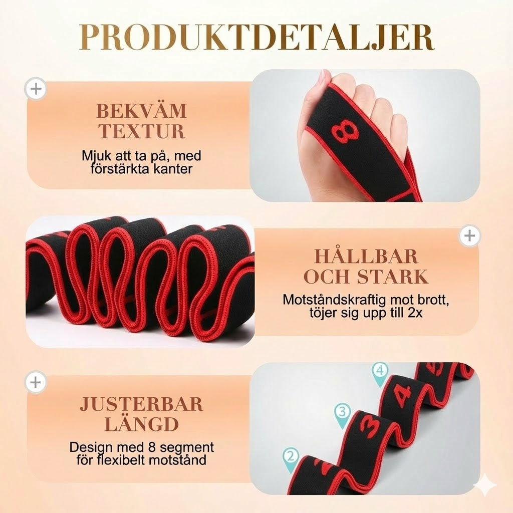 Sluta kämpa med gummiband som glider iväg eller sitter för hårt. Tack vare den smarta designen med 8 justerbara segment bestämmer du själv bandets intensitet och längd. Det här systemet gör användarvänligheten optimal och säkerställer ett säkert och kontrollerat motstånd vid varje rörelse. Oavsett om du är en nybörjare som precis har börjat eller en avancerad atlet, anpassar sig detta band ansträngningslöst till din nivå för ett brett utbud av övningar.
