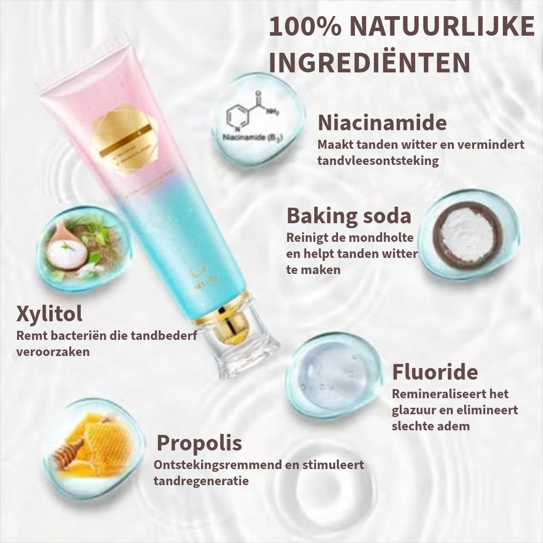 Onze tandpasta vermindert gevoeligheid en biedt een veilige manier om je tanden witter te maken zonder agressieve chemicaliën. Geen zorgen meer over pijn of ongemak bij koud of warm eten.